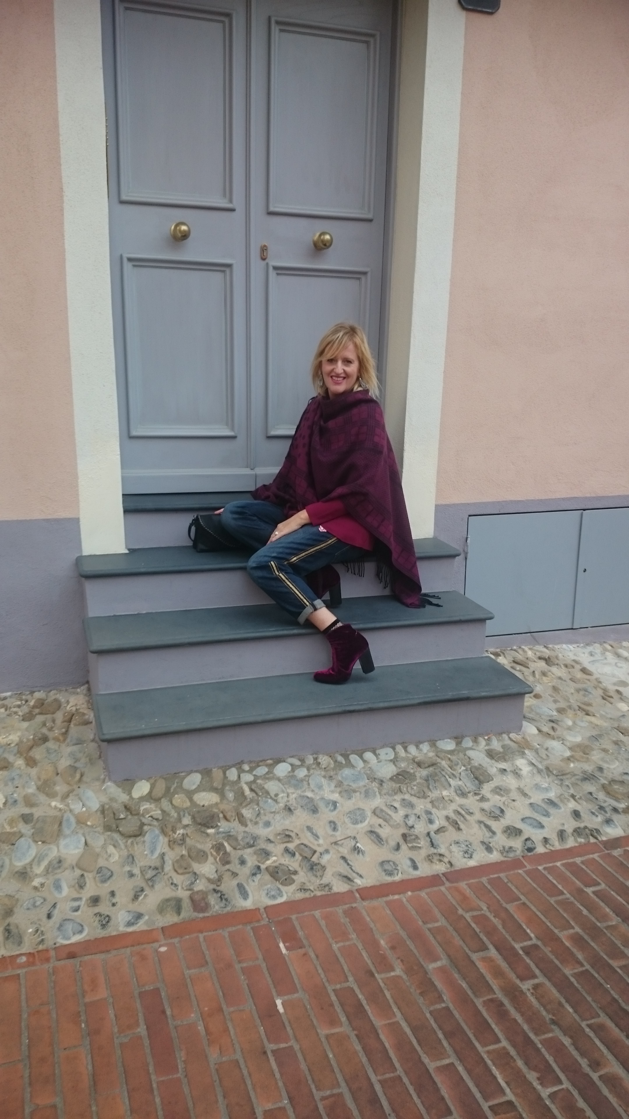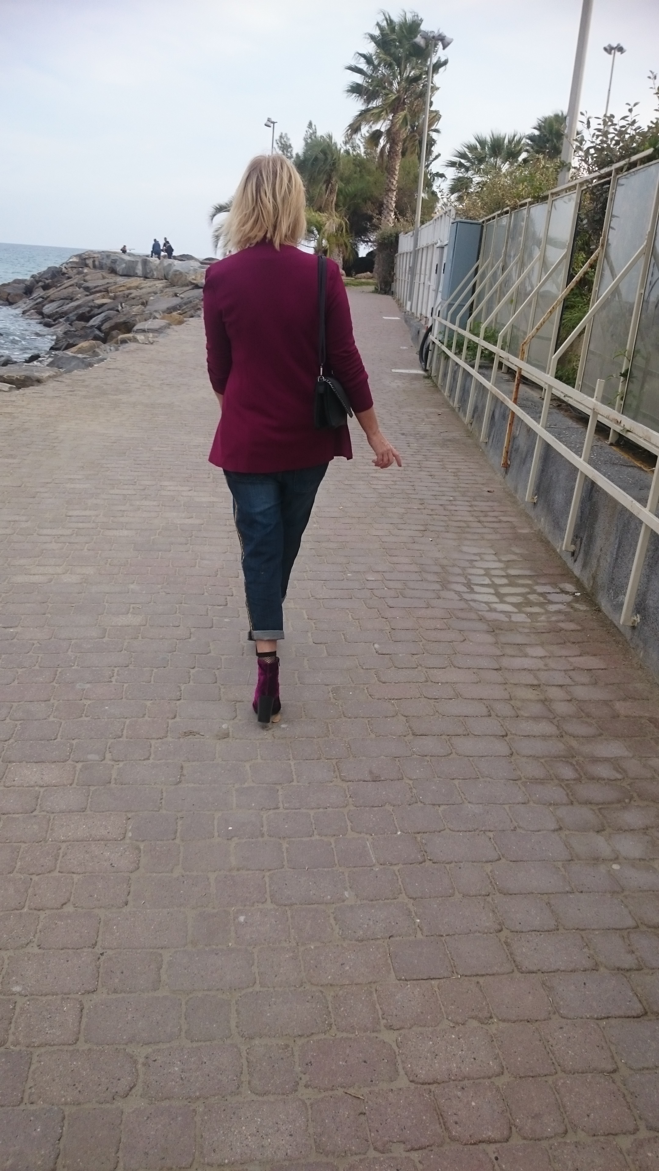 Faccio due passi sul molo, dove d’estate si svolgono molte manifestazioni canore e di spettacolo, come anche concorsi e sfilate di moda. La mia sfilata personale oggi è con un paio di jeans che adoro, modello boyfriend con banda laterale ed applicazioni. Il boyfriend è quel tipo di jeans che ha il cavallo un po’ basso, rimane morbido sulle gambe e ha una lunghezza diversa. È un modello molto confortevole e permette diversi tipi di indosso, con una scarpa bassa ci dà un look più scanzonato, mentre con un tacco ci regala quel tocco modaiolo pur essendo comodo. Basta indossare sopra un blazer per avere un allure elegante ma non troppo 😉 Sotto il blazer una blusa con rouches di colore rosa, una delle accoppiate di colori suggerite per questa stagione e che personalmente trovo molto piacevole. Gli stivaletti hanno sono in velluto, altro must di stagione, colore viola scuro. Una scarpa che non passa inosservata 😊. Borsa pochette nera morbida da portare a mano o a tracolla.