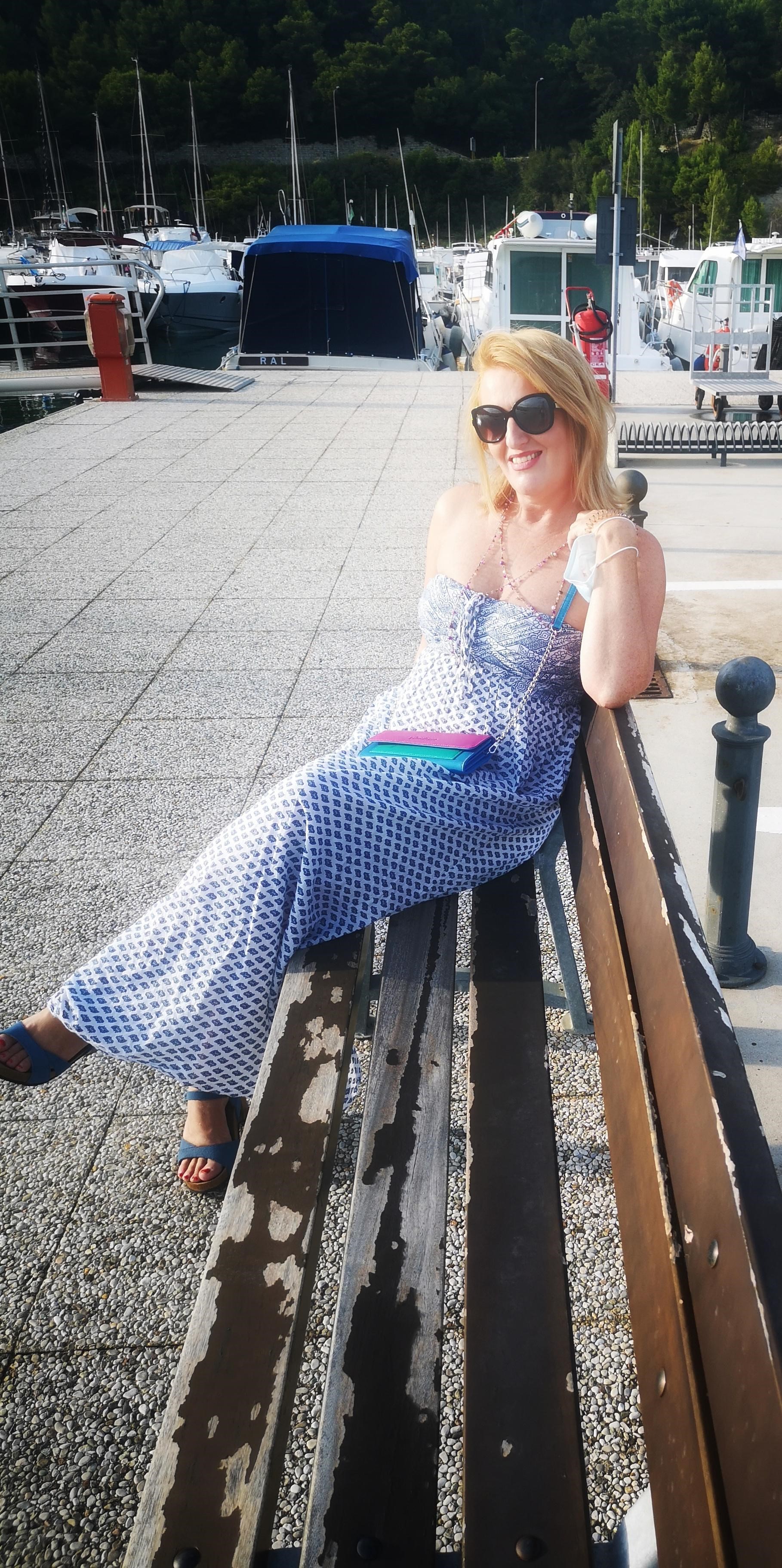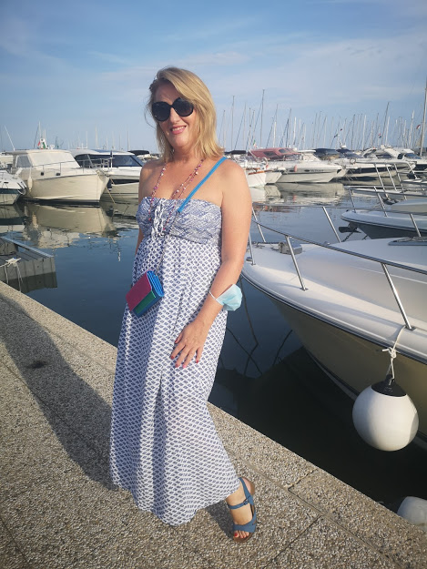 SE SIETE CURIOSE/I DI VEDERE L'OUTFIT DI IERI POMERIGGIO, SCORRETE VERSO DESTRA: Vestito lungo senza spalline, a taglio impero, di un tessuto di cotone impalpabile e leggero. A stampa tipo "batik" bianca e azzurro, perfettamente in pendant con il tema del giorno. Preso l'anno scorso da TUTTIQUANTI https://www.tqtuttiquanti.it/ di Albenga, negozio di abbigliamento low cost, dove si possono trovare tante idee carine per il quotidiano. Partendo dall'alto, occhiali da sole neri con stanghette nere, bianche e azzurre, no brand. Borsetta (che veramente è un portafoglio che si può usare anche come borsina poichè dotato di tracolla) multicolor e molto pratico se volete camminare leggere. Presa da PRIMADONNA https://www.primadonnacollection.com/it?utm_source=tradedoubler&utm_medium=banner&utm_campaign=2019_primadonna&tduid=ef1aad60203fdc943b1edd9a7bf0cb46 in saldo a pochissimo, presso il negozio dell'Ipercoop di Albenga. Collana con perline e charms di colore rosa, fatta a mano dalla mia cara Sarah-Soutache Bijoux, la trovate su Facebook e IG, ha proposte veramente originali ed uniche nel genere, gentilissima ed onesta. Non vi stò nemmeno a menzionare la mascherina, quella la conoscete già. Invece all'altro braccio, portavo un bracciale rigido di colore blu intenso/lucido che adoro. L'ho acquistai tantissimo tempo fà in una bancarella di un mercato ed è sempre bello e di gran scena, mi piace da matti indossarlo quando sono in total blu, un colore che quest'anno ho rispolverato moltissimo e che sarà in voga ancora per la prossima stagione. Ai piedi sandali del Dr. Scholl's dell'anno scorso, carini pur essendo molto comodi.
