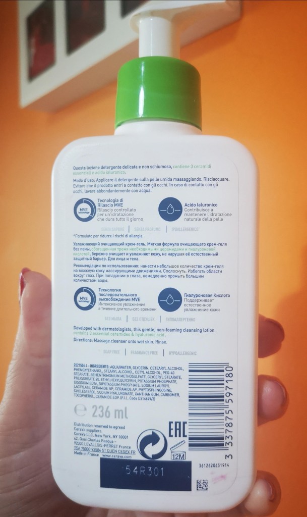 - Il terzo prodotto che ho preso in considerazione è il Detergente Idratante della CeraVE, marca con sede negli USA, di fattura francese e distribuita in tutto il mondo, che sta andando per la maggiore e che da molto desidero testare. L’ho acquistato presso la mia Farmacia di fiducia di Arianna Gasco a Leca d’Albenga, ad un prezzo scontato. Adatto per pelli da normali a secche, contiene 3 ceramidi importanti per la barriera lipidica della pelle e da un brevetto chiamato Multi Vesicular Emulsion Technology (MVE – da qui il nome) che è in grado di rilasciare gli ingredienti idratanti attraverso la pelle e mantenerla morbida per tutto il giorno.