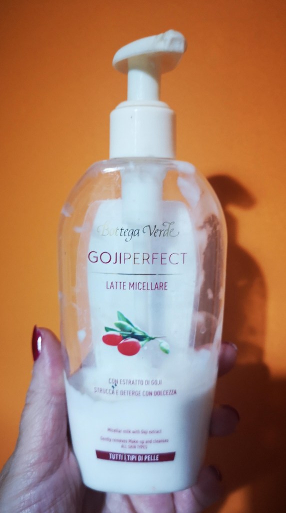 - Come potete vedere, il primo che ho iniziato ad utilizzare è il Latte Micellare di Bottega Verde, formulato con estratto di Goji e olio di Argan, promette di eliminare make-up e segni di inquinamento. Senza risciacquo, si può levare facilmente con un dischetto di cotone.