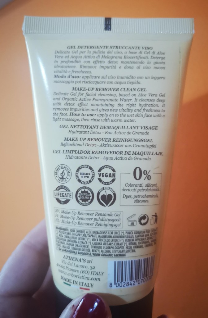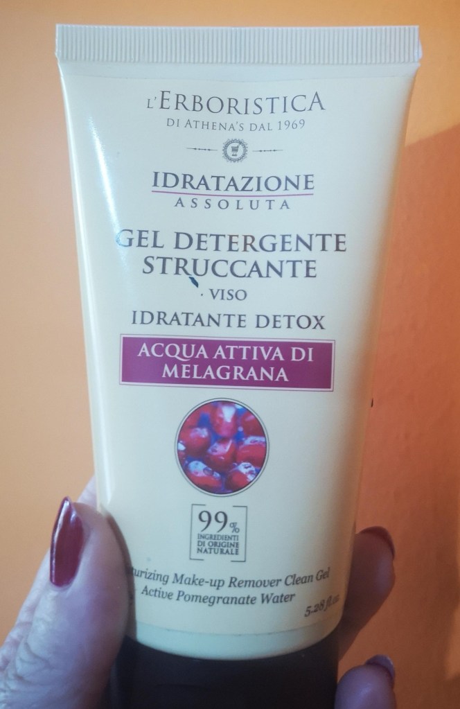 - Il secondo prodotto è il Gel Detergente Struccante Viso de L’Erboristica di Athena’s dal 1969, un gel delicato all’acqua attiva di melagrana e aloe vera, biocertificati, che si applica sul viso inumidito, si risciacqua con acqua tiepida, e svolge un’azione detox, donando una sferzata di freschezza.