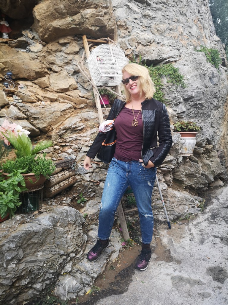 Ai piedi un paio di sneakers color viola melanzana metallizzato, prese in saldo ad Andora. Sono di NEW BALANCE, brand che mi è stato consigliato per avere una pianta ampia e una buona comodità ed in effetti non posso far altro che confermare. Avendo il piede abbastanza problematico (vedi principio di alluce valgo, dita a martello...etc etc), con queste cammino tranquillamente per diverse ore e arrivata a casa non sento la necessità di levarle. Inoltre i modelli sono tutti molto accattivanti. La borsa che vedete appoggiata sul muretto è di Bagghy, brand che non conoscevo e che ho trovato, in saldo naturalmente, ai Magazzini delle Firme Outlet, negozio che si trova, guarda caso, proprio a Cisano sul Neva. In ecopelle molto fatta nera, ha una bellissima catena di colore bianca e arancio, che è attaccata da un moschettone, quindi si può levare all'occorrenza. E' un modello shopper molto lineare e parecchio capiente e si può chiudere con una cerniera. Mi piace moltissimo e la uso praticamente ogni giorno.
