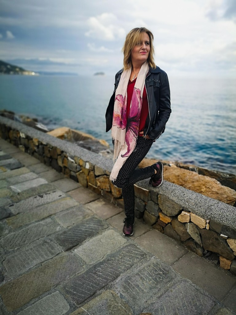 Dopo aver tagliato i capelli, il mio animo si è sentito parecchio rockettaro. Infatti, ho tirato fuori dall'armadio un paio di jeans che non indossavo da tempo e che avevo timore di non riuscire più ad indossare. Invece, EUREKA!, ci sono entrata. Un jeans che sicuramente non passa inosservato: la parte davanti è tempestata di swarovski luminosissimi, abbinati ad alcuni rotture, rendono queto capo un pezzo unico. Di colore nero-grigio, sono di Annacristy Milano. La blusa color rosso scuro è anch'essa di Annacristy, la indosso sempre volentieri perchè bella morbida e con uno scollo che dà aria al decollete. Sopra un chiodo nero che adoro. In similpelle veramente notevole, è un modello un pò differente dai soliti, per questo mi aveva colpito. Acquistato in saldo presso i Magazzini delle Firme Outlet di Cisano, una di quelle scoperte davvero top. Le sneakers sono sempre quelle color viola melanzane, di cui vi ho parlato nell'articolo scorso. Ma il vero tocco di colore lo dà la sciarpina di Innbamboo. Brand Made in Italy che nasce a Firenze nel 2013, diffidate dalle imitazioni. Il loro progetto etico si basa sull'utilizzo del bamboo, non solo per sciarpe ma anche per borse, scarpe e mascherine. Certificata vegan, io l'ho trovata presso la Farmacia Borgarello di Andora dove avevano diversi modelli con fantasie ispirate a grandi pittori (un regalo graditissimo da parte della mia dolce mammina), ma potete fare un giro sul loro bellissimo sito e-commerce.