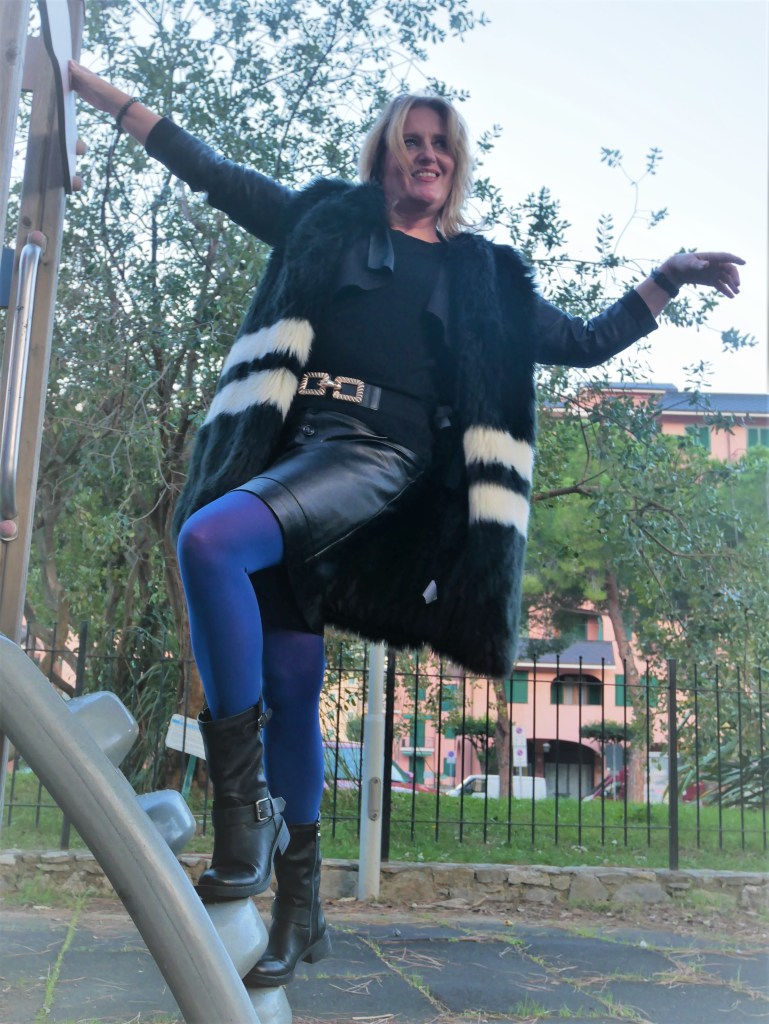 Sì perché, indosso le gonne molto di rado e di questa lunghezza e forma è da moltissimo tempo che non ne acquisto. La similpelle è di gran tendenza, e questa gonna mi ha conquistato da subito. La qualità è ottima, a vederla sembra quasi di vera pelle, ha una lunghezza media e comunque adatta anche per le donne che come me, non sono più così “giovini” , è fashion da matti ed è pure comoda! Davanti ha una serie di bottoni funzionali e due belle tasche e permette di muoversi liberamente. L’ho acquistata da “Roba da Matti” nel centro storico di Albenga, dalla mia cara amica Luana, con la quale realizziamo tanti divertenti shooting fotografici, utili anche per scegliere capi che magari non avremmo mai pensato di acquistare. Anche la maglietta nera l’ho presa da lei! Basica a costine, con le maniche a 3/4 e lo sbuffo sulle spalle, così anche come la cintura, ad elastico, mettibile sopra qualsiasi outfit. A completare giacchina in similpelle presa da Zara parecchio tempo fa, gilet in similpelliccia, pezzo di campionario preso alle bancarelle a Torino (vi metto il link al precedente articolo dove lo indosso: