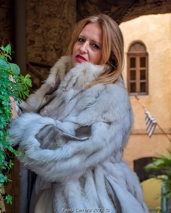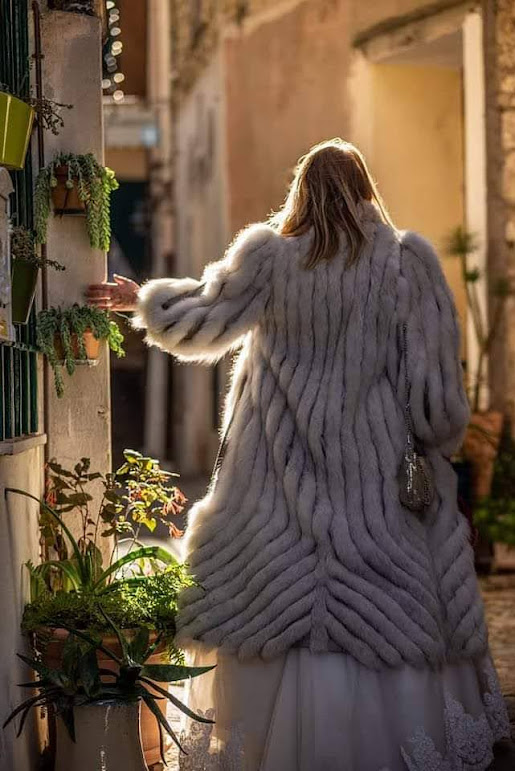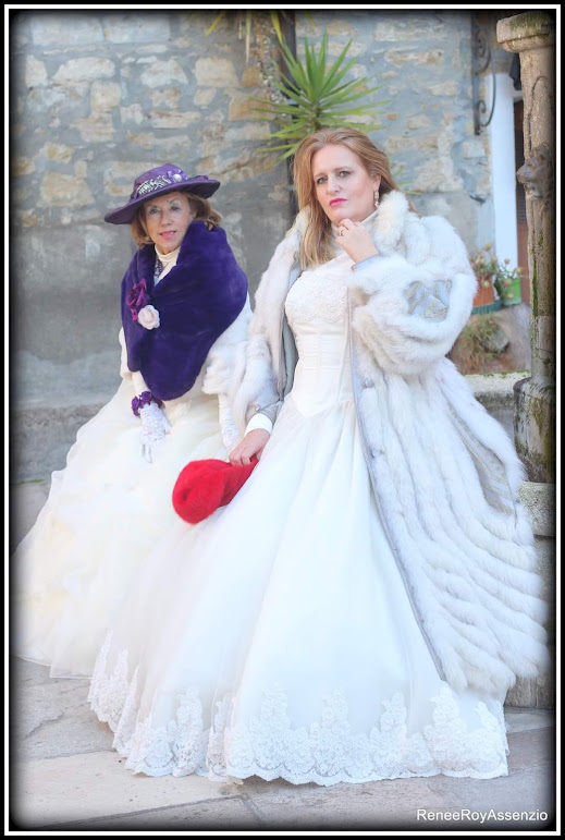 Per questo shooting davvero unico, ho scelto un abito da sposa dal fascino fiabesco (come d'altronde tutti gli abiti di Cinzia), con gonna a ruota e strascico, impreziosito da un bellissimo ricamo. Sopra ho indossato una pelliccia molto scenografica, gentilmente prestata da un'amica che si è offerta di darmela per l'occasione, non appena vista la foto dell'abito da me scelto. Per dare un tocco di colore e quale completamento dell'outfit, ho utilizzato un cappello rosso, che a dire il vero ho usato per lo più appoggiato al vestito. Sempre un'emozione grande poter sfilare con questi meravigliosi abiti. Ps: e sotto naturalmente, anfibi o scarpe comode!